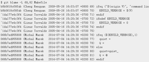 第一列是commit id;接下来是提交人、提交时间。注意一下 ^1da177e4c3f4 这个提交的几行,其中的前缀 ^ 指出了该文件自第一次提交后从未修改的那些行。