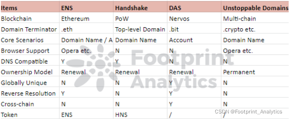 本文重点以主流的去中心化域名项目 ENS,Handshake,DAS,以及 Unstoppable Domains 进行对比和分析:
