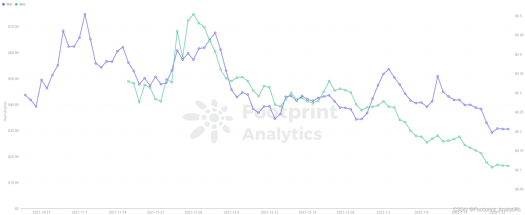 从 Footprint Analytics 数据看,目前有发行Token的项目仅 ENS 和 Handshake,从价格趋势上看,$ENS 从最高70美金目前已下跌至23美金,而 $HNS 的价格也一直在0.2-0.5美金波动,未有明显的增长趋势。