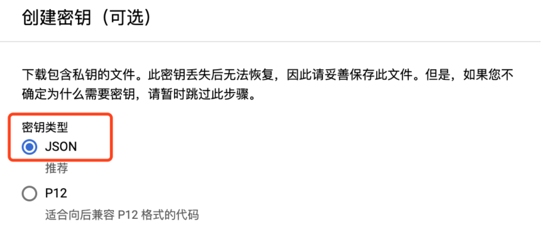 7. 选择 JSON 后点击创建,然后选择将生成的 JSON 文件保存到本地。