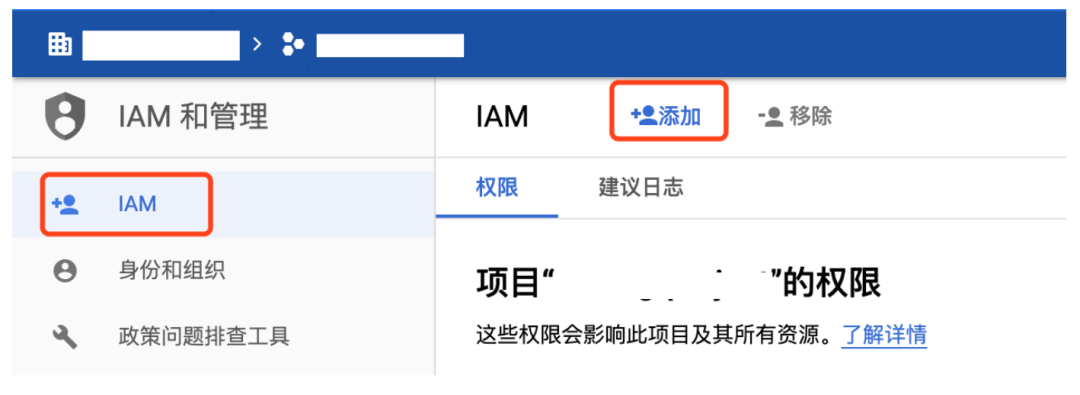 1. 在 IAM 和管理页面,点击 IAM,然后点击添加。
