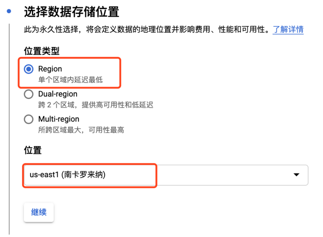 存储分区应与在第 1 步配置的 `gcsManagedLedgerOffloadRegion` 值一致。