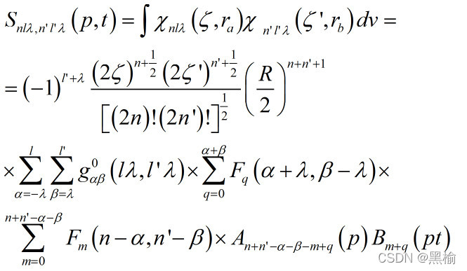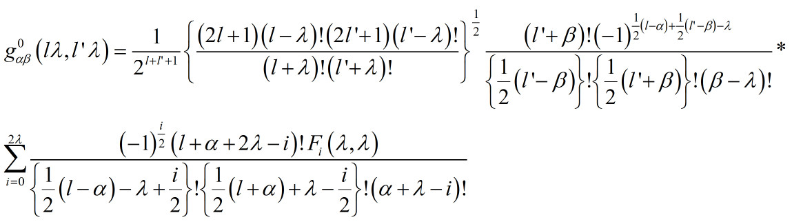 其中的F函数就是前文得到的FmNN( int m ,int N, int N1 )方法,gαβ函数就是前文得到的gαβ( int La, int Lb, int λ, int α ,int β )方法,由这个公式得到了第二种计算重叠积分的方法Sab(double R,double za,double zb, int n1,int L1 ,int mm ,int n2 ,int L2 )。