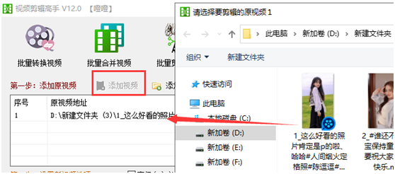 在原视频的地址栏中,先点开“添加视频”将准备好的视频素材导入