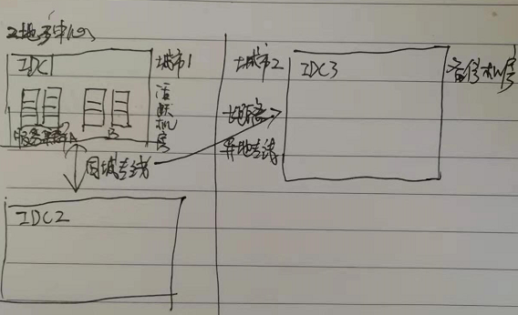 3. 同城双活,前面讲到的几种方案,基本都是在一个局域网内进行的。业务发展到后面,有了同城多活的方案。和前面比起来,不信任的粒度从机器转为了机房。这种方案可以解决某个IDC机房整体挂掉的情况(停电,断网等)。