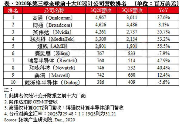 据集邦科技(TrendForce)旗下拓墣产业研究院发布的排名显示,2020年Q3全球前十大IC设计公司营收排名出炉,在公布的《全球前十大IC设计公司营收排名》上,高通公司2020年Q3季度的营收规模达到了49.67亿美元,相比去年同期增长了37.6%,排名第二的则是博通,营收46.26亿美元,英伟达、联发科、AMD等则分别排在三四五位。华为遗憾地跌出前十名。