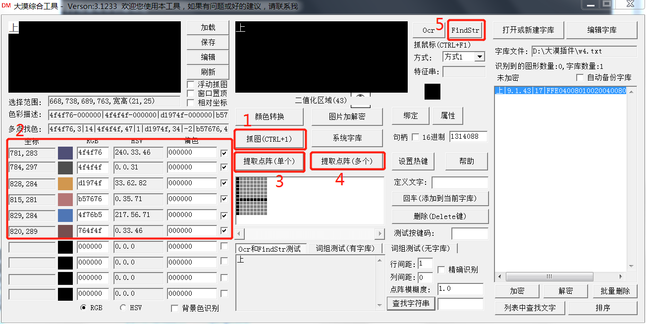 Dim wenzi// GetStr(), 第一个参数表示几号字库,2-5个参数表示识别范围,最后一个参数通过多点找色获得(可以通过第5步中点击FindStr拷贝)