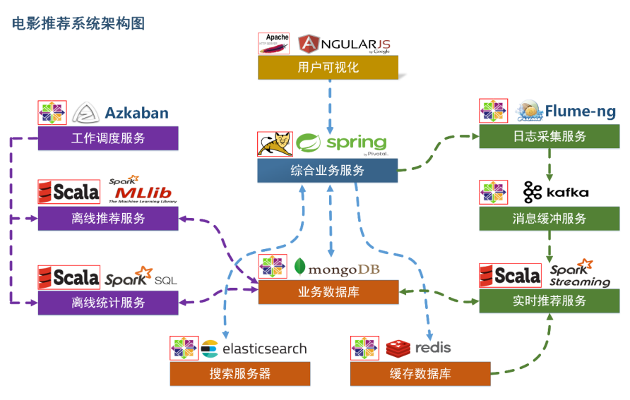 缓存数据库: 项目采用 Redis 作为缓存数据库, 主要用来支撑实时推荐系统部分对于数据的高速获取需求。