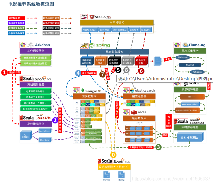 项目采用 ALS 作为协同过滤算法 分别根据 MongoDB 中用户评分表和电影数据集计算用户电影推荐矩阵以及电影相似度矩阵。
