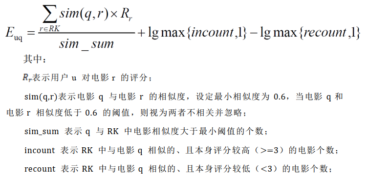 然后,将 u 最近的 K 个评分中与电影 q 相似的、且本身评分较高( >=3)的电影个数记为 incount,计算 lgmax{incount,1}作为电影 q 的“增强因子”,意义在于电影 q 与 u 的最近 K 个评分中的 n 个高评分(>=3)电影相似,则电影 q 的优先级被增加 lgmax{incount,1}。如果电影 q 与 u 的最近 K 个评分中相似的高评分电影越多,也就是说 n 越大,则电影 q 更应该被推荐,所以推荐优先级被增强的幅度较大;如果电影 q 与 u 的最近 K 个评分中相似的高评分电影越少,也就是n 越小,则推荐优先级被增强的幅度较小;而后,将 u 最近的 K 个评分中与电影 q 相似的、且本身评分较低( <3)的电影个数记为 recount,计算 lgmax{recount,1}作为电影 q 的“削弱因子”,意义在于电影 q 与 u 的最近 K 个评分中的 n 个低评分(<3)电影相似,则电影 q 的优先级被削减 lgmax{incount,1}。如果电影 q 与 u 的最近 K 个评分中相似的低评分电影越多,也就是说 n 越大,则电影 q 更不应该被推荐,所以推荐优先级被减弱的幅度较大;如果电影 q 与 u 的最近 K 个评分中相似的低评分电影越少,也就是 n 越小,则推荐优先级被减弱的幅度较小;最后,将增强因子增加到上述的预测评分中,并减去削弱因子,得到最终的 q 电影对于 u 的推荐优先级。在计算完每个候选电影 q 的 后,将生成一组<电影 q 的ID, q 的推荐优先级>的列表 updatedList:
