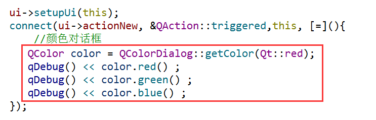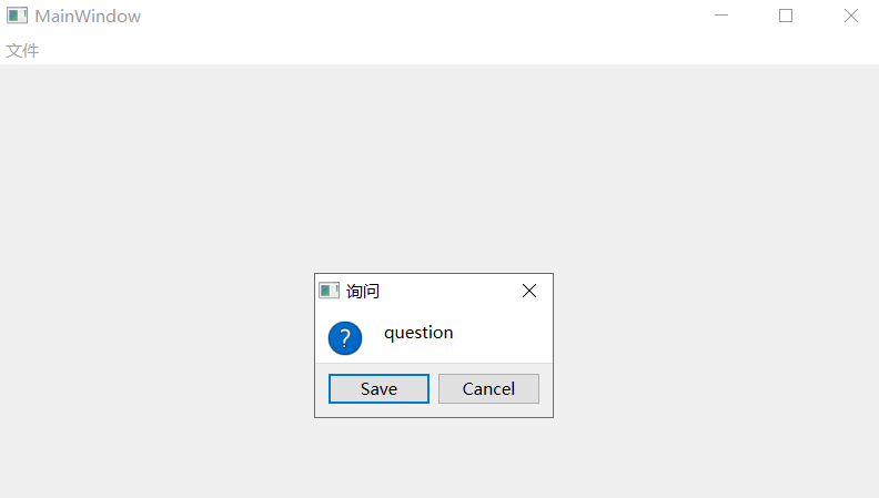 connect(ui->actionNew, &QAction::triggered, [this](){ //询问提示对话框 if(QMessageBox::Save == QMessageBox::question(this,"询问","question",\ QMessageBox::Cancel|QMessageBox::Save,\QMessageBox::Cancel)) { qDebug() << "点击的是保存"; } else { qDebug() << "点击的是取消"; } });