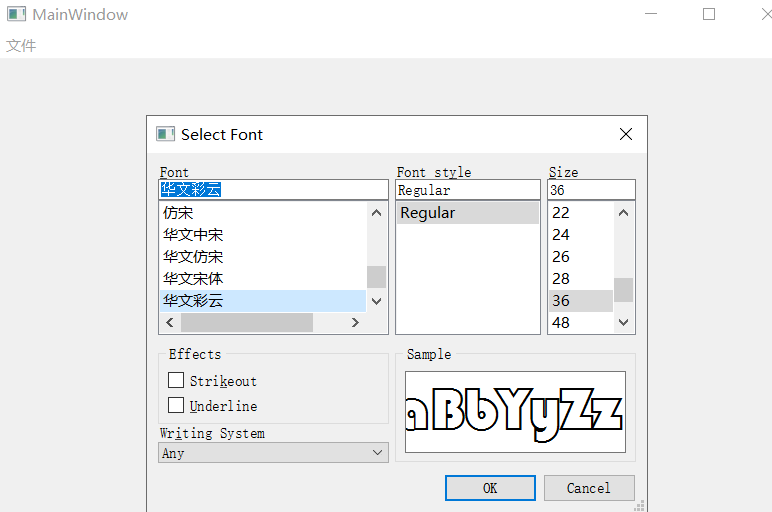 bool flag; QFont font = QFontDialog::getFont(&flag, QFont("华文彩云",36)); qDebug() << "字体" << font.family().toUtf8().data() << "字号"<< font.pointSize() << "是否加粗"<<font.bold() << "是否倾斜" << font.italic();