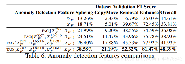 (见表6中的Enhance列),但不是拼接,copy-move或删除。相反,半随机模型这允许这些权值在较低的学习中更新速率5e-5防止过拟合和收敛到一个更好所有伪造类型的特征表示。因此,我们使用半随机模型在以后的实验