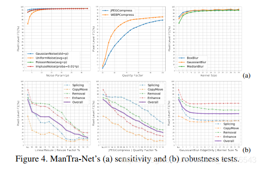 考虑三种后处理操作,缩放、压缩、边缘模糊,最后,虽然局部模糊在欺骗基于边缘的伪造检测方法方面是非常有效的,但mantranet对这类攻击是相当免疫的。