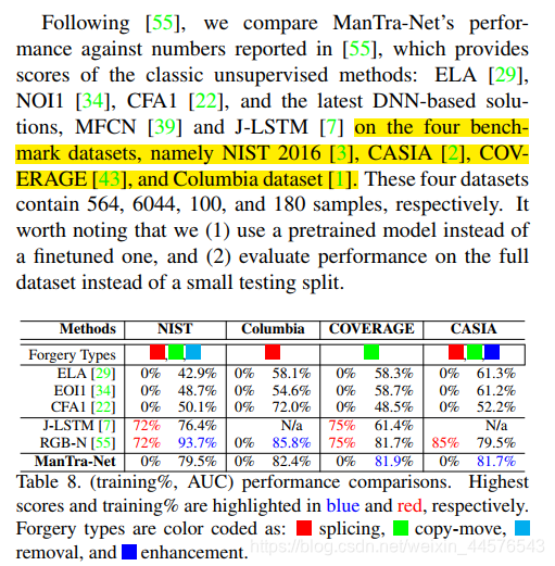 以上部分已经说明了篡改痕迹特征和异常检测网络,在标注数据集中评估其泛化性能、敏感性、鲁棒性能等,使用AUC作为性能评估标准,由于网络中少部分原始像素错误认为篡改像素,在网络中并未得到惩罚(一定程度上会造成误检过高),因此如果mask出现一半以上的篡改区域,我们则不认同。参考文献(Fighting fake news: Image splice detection via learned self-consistency)