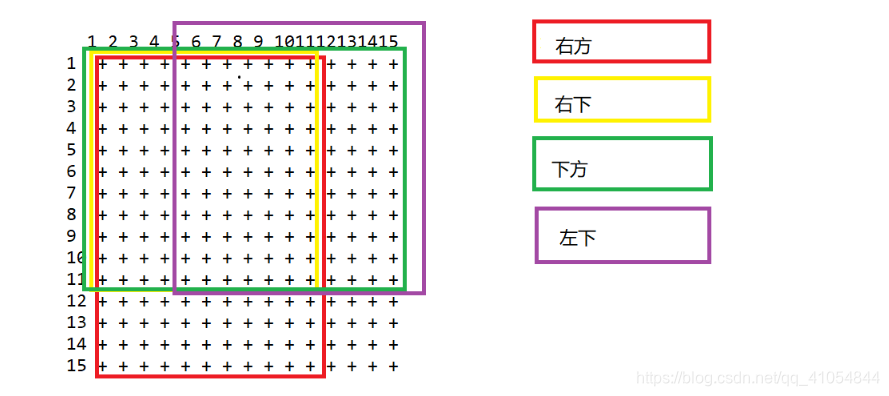 19,要注意一点,不是从头遍历尾对棋盘,比如右方向,其实只要遍历所有行,但是列只要遍历到倒数第五行就行,因为剩下四个不可能物资连珠,同理其他方向也一样,具体遍历范围如图。