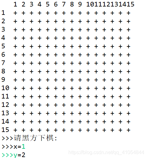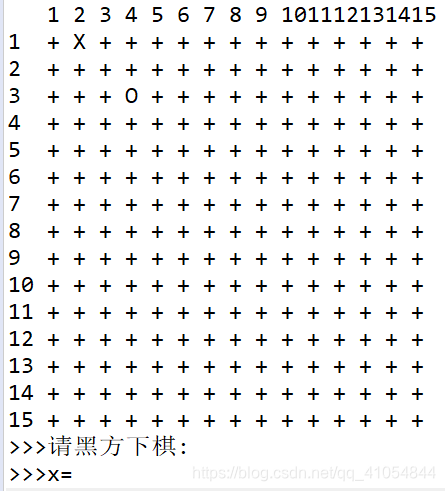 8,注意一点,"+ ",是下棋的位置,刚开始棋盘都是它,因此有棋盘的样子,当玩家落子后它就被改变为相应颜色的棋子X或者O,并且每次落完子都要打印一变落完棋子后棋盘变成什么样子了,即更新棋盘。