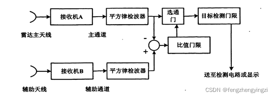 在雷达主天线的主瓣上的增益远远大于辅助通道的增益,因此主天线主瓣接收到的信号强度会远大于辅助通道,在辅助通道的增益又大于主天线所有方向的旁瓣增益,因此通过辅助通道的检测到的任何目标信号,比出现在天线主通道的旁瓣都会有更强的信号。