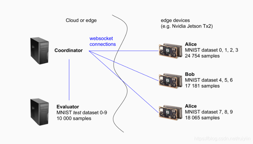 在此示例中,训练将在不同的边缘设备上执行。在我们的实验室中,我们为此使用了Nvidia Jetson Tx2设备。训练任务是MNIST数据集上的图像分类任务,其中包含0-9范围内的手写数字图像。训练数据集的样本以这样一种方式分配给三个工作人员(分别称为Alice,Bob和Charlie),即每个设备只能看到一定范围的数字,并且只能使用这些数字来训练模型。由于结合了学习,即使在每个训练步骤中只有一部分数字可用,最终获得的模型仍将能够识别所有数字。