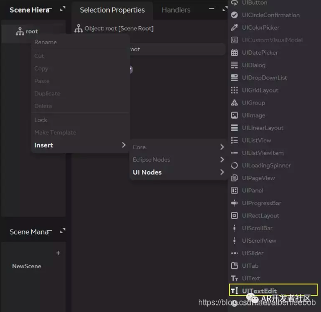 单击 Insert > UI Nodes > UITextEdit。UITextEdit提供了一种使用系统键盘输入文本的简单方法。