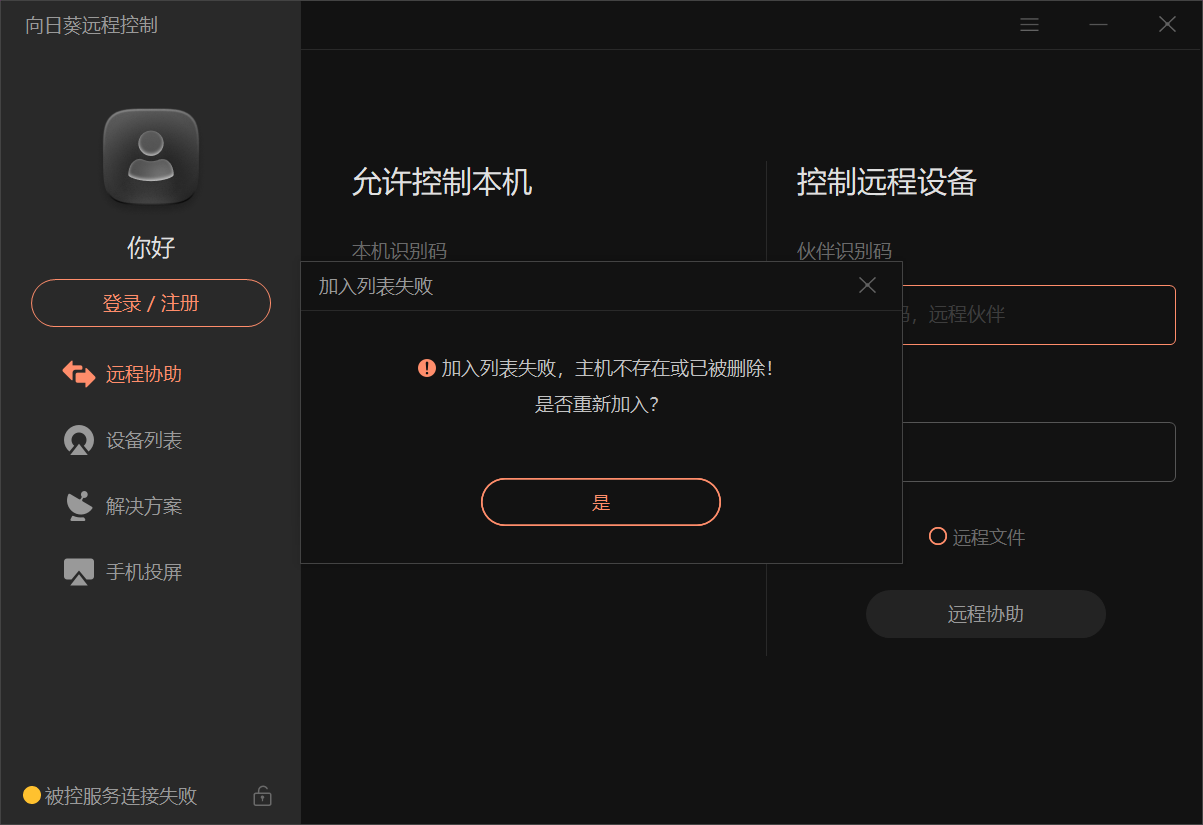 本文主要是介绍向日葵远程协助软件提示“加入列表失败,主机不存在或已删除”、“被控服务连接失败”处理办法,希望对大家解决编程问题提供一定的参考价值,需要的开发者们随着小编来一起学习吧!