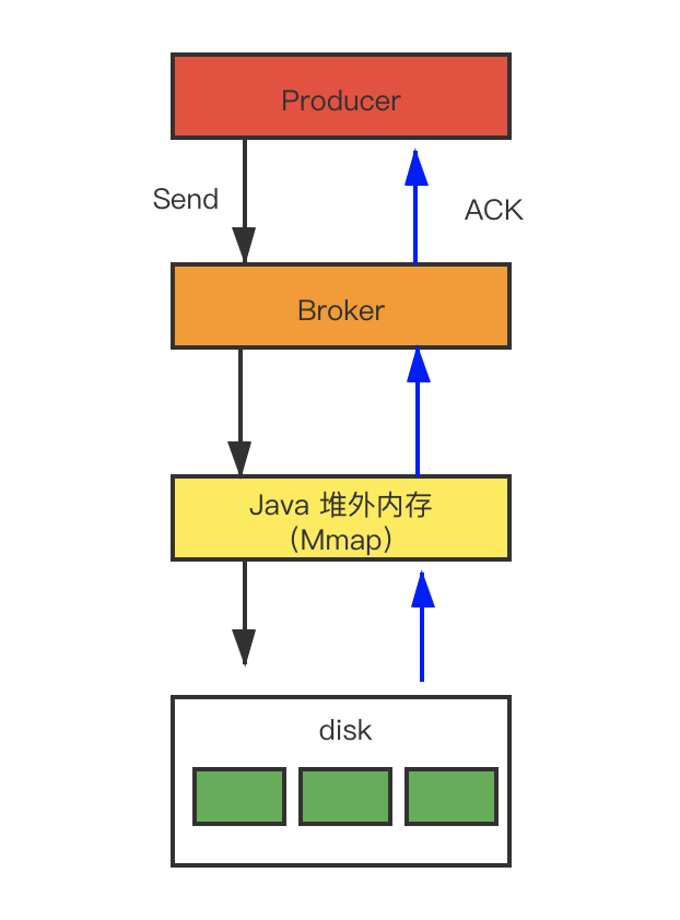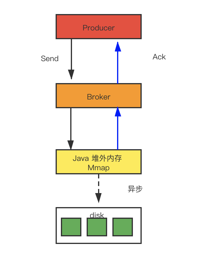 当生产者发送消息时,broker 会将消息存储到 commit 文件下,然后再异步的转存到 consumeQueue 以及 indexFile。