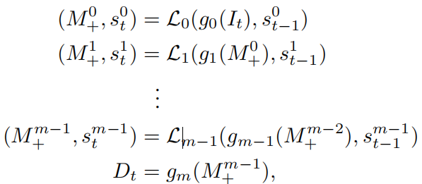 让我们首先将我们的单帧检测器定义为函数G(It)=dt。此函数将用于构造具有m 个LSTM层的复合网络。 我们可以将这些LSTM看作是将G的层划分为M1子网络{G0,G1,.....GM)满足: