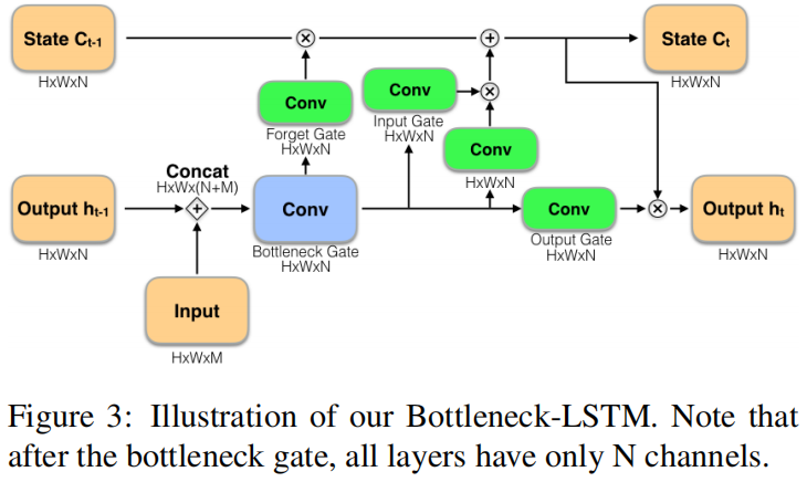 然后,bt替换所有其他门中的输入,如图3所示。我们把这个新的表述称为瓶颈-LSTM。这种修改的好处有两方面。使用瓶颈特征映射减少了门中的计算量,在所有实际场景中都优于标准的LSTM。其次,瓶颈-LSTM比标准的LSTM更深,这与经验证据[12,13]一样,深层次模型优于广义和浅层模型。