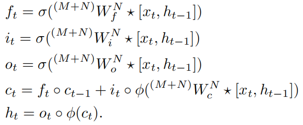 我们也有兴趣使LSTM本身更有效率。设M和N分别是LSTM的输入和输出通道数。由于卷积LSTM的定义在不同的工作[34,30]中有所不同,我们将定义一个标准的卷积LSTM: