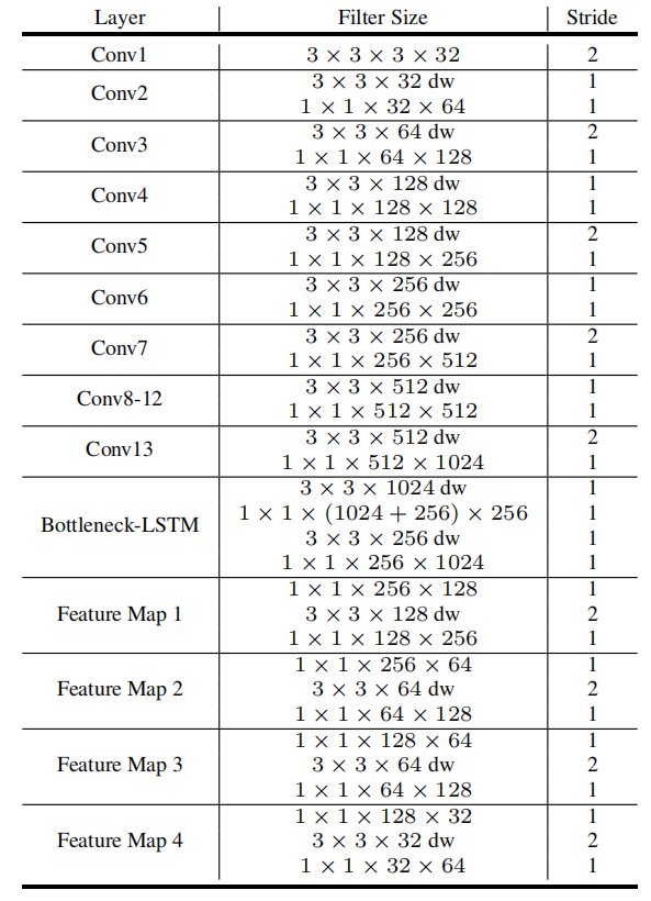 表1:在我们的LSTM-SSD架构中使用一个256通道状态的单一LSTM的卷积层。“dw”表示深度卷积。最后的包围框是通过应用附加卷积到瓶颈-LSTM和特征映射层。请注意,我们将所有四个LSTM门计算合并成一个卷积,因此LSTM计算1024个门通道,但只输出256个通道。