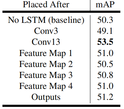 首先,我们在模型的各个层之后放置一个LSTM。表2确认,在特征映射之后放置LSTM会带来更好的性能,Conv 13层提供了最大的性能。改进,验证我们的说法,即在特性空间中添加时态感知是有益的。