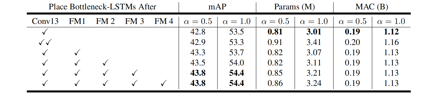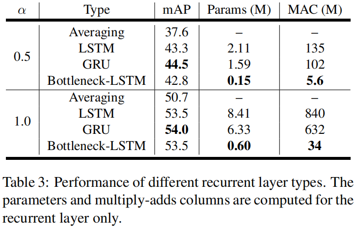 接下来,我们将我们提出的瓶颈-LSTM与其他递归层类型进行了比较,包括平均层、LSTM和Grus[2]。在这个实验中,我们在Conv 13层之后放置了一个单一的递归层。并对α=1和α=0.5的模型进行评估。作为基线,我们使用连续帧中的特征加权平均,当前帧的权重为0.75,前帧的权重为0.25。瓶颈-lstm的输出通道维是根据扩展的宽度乘子来减小的,但是所有其他的递归层类型都有相同的输入和输出维,因为它们不是。设计用来做瓶颈的。结果见表3。我们的瓶颈LSTM是一个数量级的数量级,比其他重复层更有效,同时达到类似的性能。