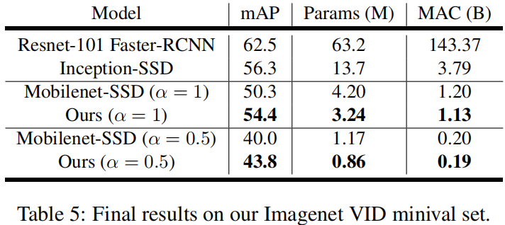 在表5中,我们将我们的最终模型与最先进的单一图像检测框架进行了比较.所有基线都使用开源的TensorFlow对象检测API[18]进行训练。在这些方法中,只有MobienetSSD变体和我们的方法可以在移动设备上实时运行,而且我们的方法在所有指标上都优于Mobilenet-SSD。显示了质量上的差异。如图5所示。我们还包括以性能为中心的体系结构,这些体系结构在计算上更昂贵。我们的方法以一小部分成本接近InceptionSSD网络的准确性。此外,我们还包括RESNET的参数和mac-rcn,以突出我们的方法和非移动视频对象检测方法之间的巨大计算差异。包括同样昂贵的基本网络。