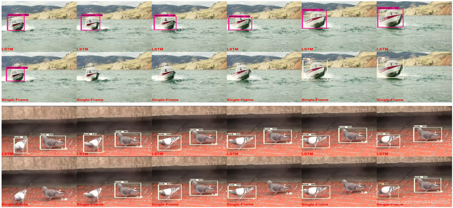 图5:ImagenetvidMinival集中的示例剪辑,其中我们的模型(α=1)优于类似的单帧Mobilenet-SSD模型(α=1)。我们的网络使用时态上下文来提供重要的更稳定的帧检测。每个序列的上一行对应于我们的模型,下一行对应于Mobilenet-SSD。