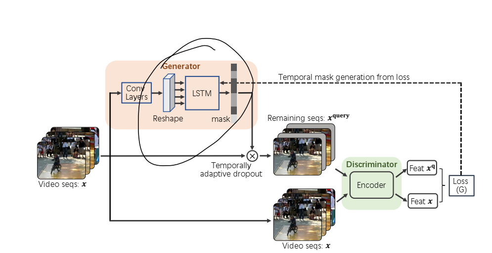使用对抗的方法,引入了对于时序robust的正样本,具体方式为使用lstm随机drop掉video clip中的一些帧,同时由于负样本的队列中,越早进入的样本与正样本的差距越大,故给队列中的负样本一个权重系数(小于1),越新的样本权重越大。