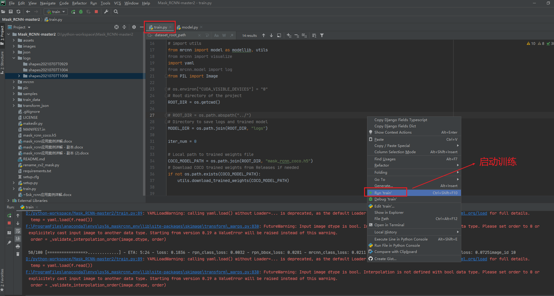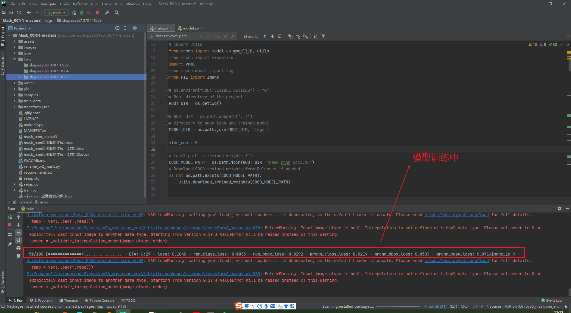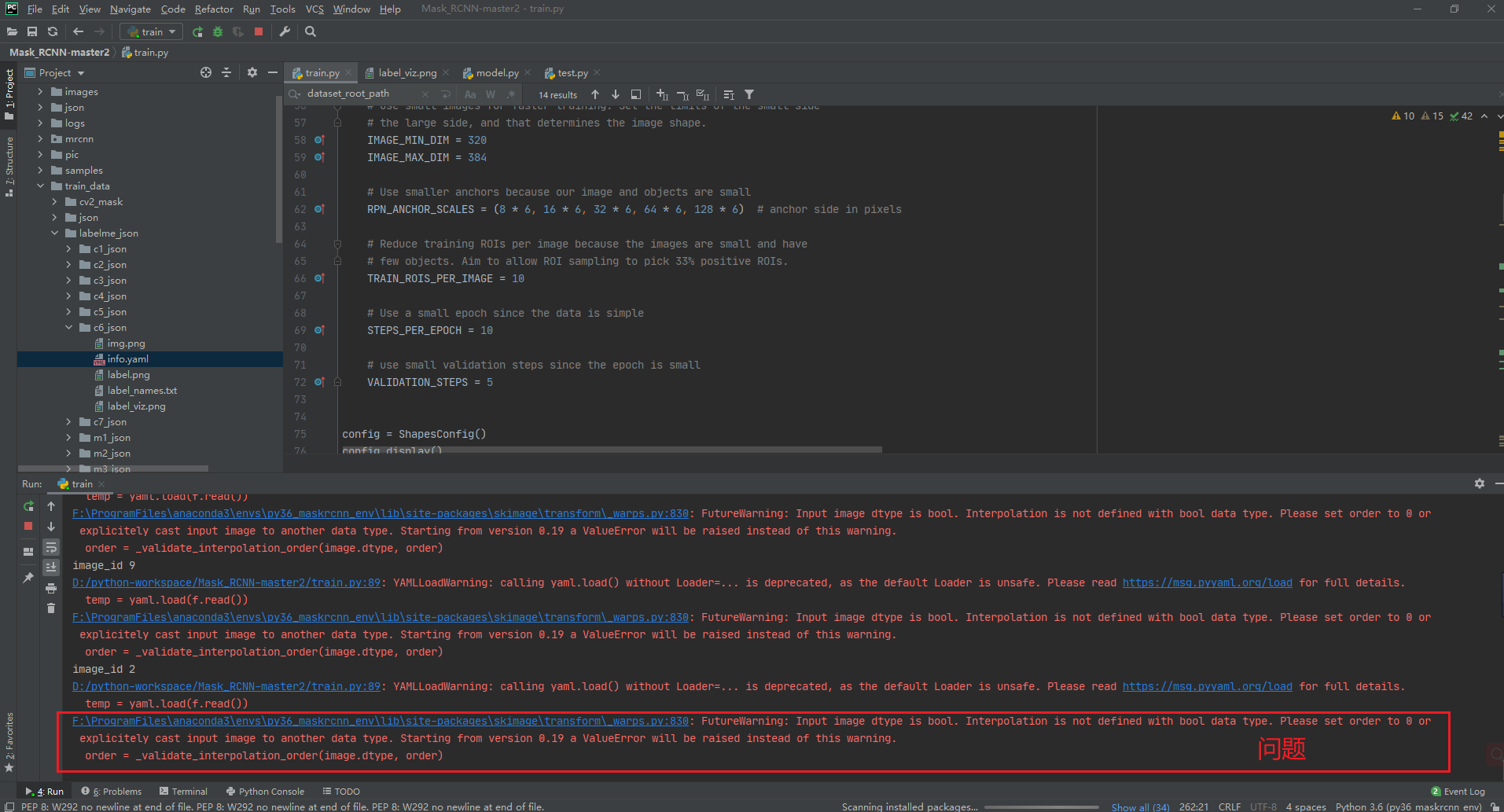 6.问题:执行 Run ‘train.py’训练模型时,提示警告信息:F:\ProgramFiles\anaconda3\envs\py36_maskrcnn_env\lib\site-packages\skimage\transform\_warps.py:830: FutureWarning: Input image dtype is bool. Interpolation is not defined with bool data type. Please set order to 0 or explicitely cast input image to another data type. Starting from version 0.19 a ValueError will be raised instead of this warning.