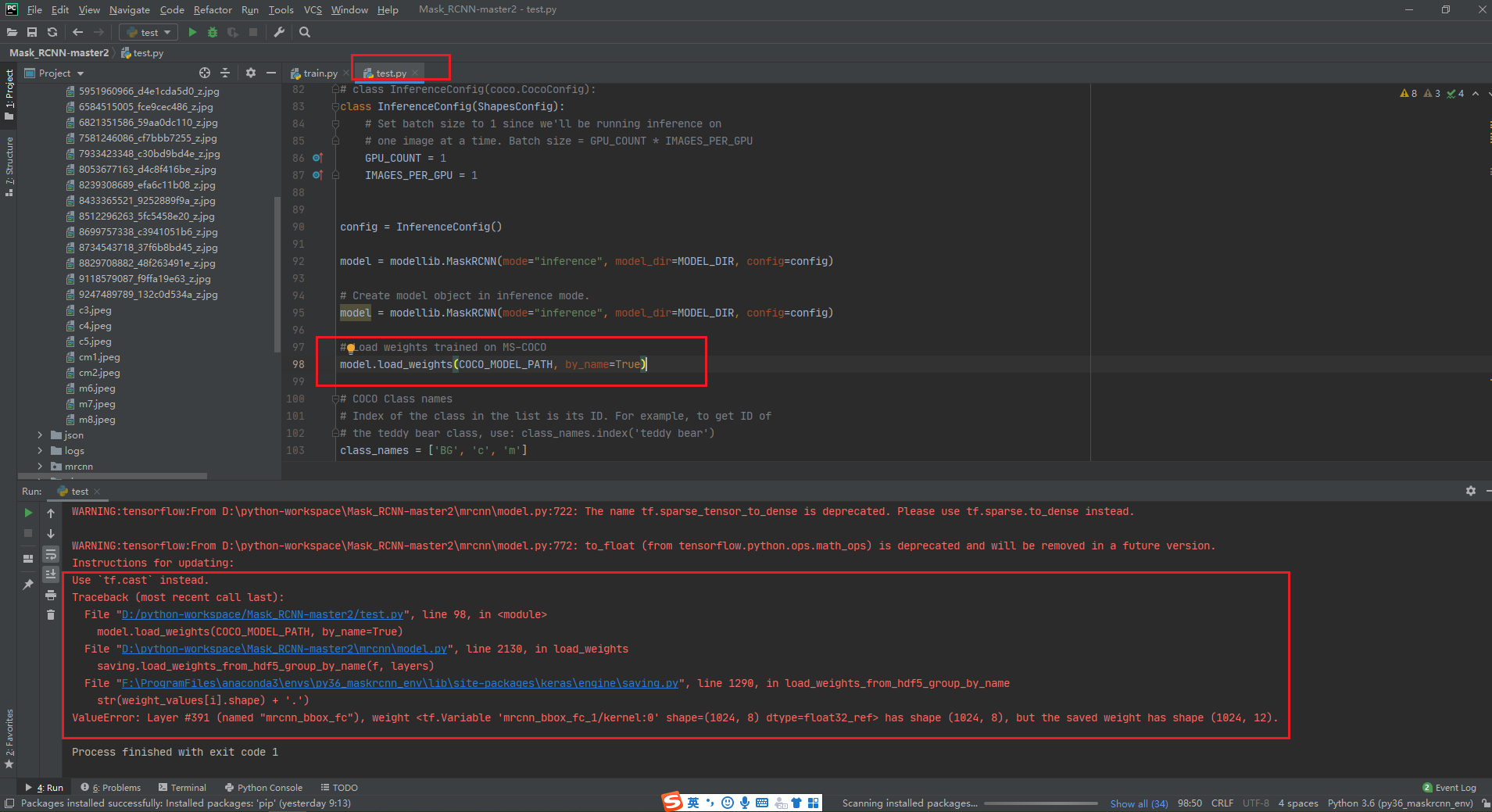 5.问题:测试.h5模型代码test.py出错,ValueError: Layer #391 (named "mrcnn_bbox_fc"), weight <tf.Variable 'mrcnn_bbox_fc_1/kernel:0' shape=(1024, 8) dtype=float32_ref> has shape (1024, 8), but the saved weight has shape (1024, 12).