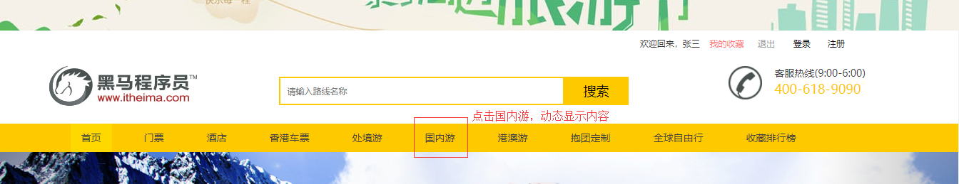 $(function() {// 登录者的名字$.get("user/findName", {}, function(data) {//alert(data)var msg = "欢迎回来," + data.name;$("#name_span").html(msg);});$.get("category/findAll", {}, function(data) {// 拼接分类数据,展示的一级菜单var lis = '<li class="nav-active"><a href="index.html">首页</a></li>'for (var i = 0; i < data.length; i++) {var li = '<li><a href="route_list.html?cid=' + data[i].cid + '">'+ data[i].cname + '</a></li>'lis += li;}lis += '<li><a href="favoriterank.html">收藏排行榜</a></li>';$("#category").html(lis)$("#search-button").click(function(){var cid = getParameter("cid");var rname = $("#search_input").val();location.href="http://localhost:8080/travel/route_list.html?cid="+cid+"&rname="+rname})})})