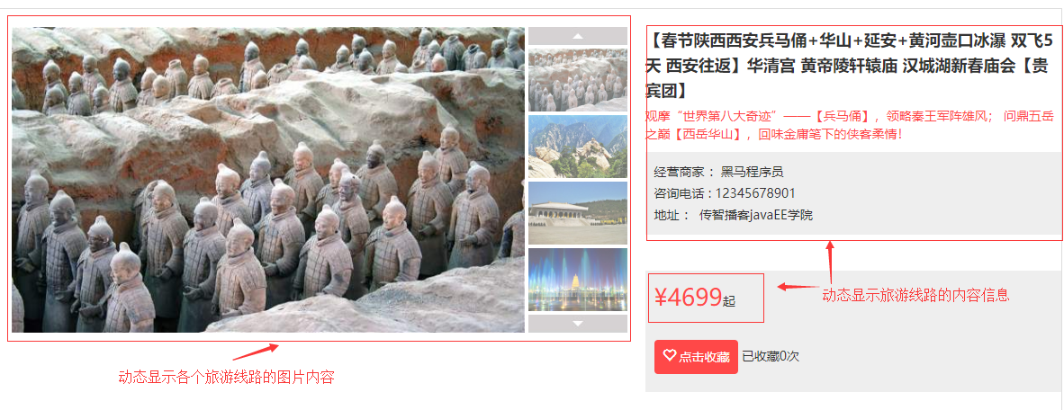 function showMain() {// 获取ridvar rid = getParameter("rid");// 发送 ajax 请求$.get("route/findOne",{rid : rid},function(route) {// alert(route.rname);// 设置相应内容$("#rname").html(route.rname);$("#price").html("¥" + route.price);$("#routeIntroduce").html(route.routeIntroduce);$("#sname").html(route.seller.sname);$("#consphone").html(route.seller.consphone);$("#address").html(route.seller.address);$("#counts").html("已收藏" + route.count + "次")// 设置图片轮播var bigImg = '<img alt="" class="big_img" src="'+ route.routeImgList[0].bigPic + '">';$("#BigImg").html(bigImg);var ddStr = ' <a class="up_img up_img_disable"></a>';for (var i = 0; i < route.routeImgList.length; i++) {var aStr;if (i >= 4) {aStr = '<a title="" class="little_img" data-bigpic="'+ route.routeImgList[i].bigPic+ '" style="display:none;"><img src="'+ route.routeImgList[i].smallPic+ '"></a>'} else {aStr = '<a title="" class="little_img" data-bigpic="'+ route.routeImgList[i].bigPic+ '" "><img src="'+ route.routeImgList[i].smallPic+ '"></a>'}ddStr += aStr;}ddStr += '<a class="down_img down_img_disable" style="margin-bottom: 0;"></a>';$("#dd").html(ddStr);goImg();})