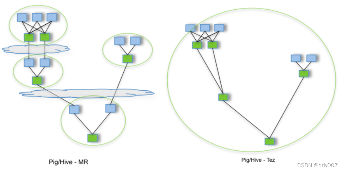 通过允许诸如Apache Hive和Apache Pig之类的项目运行复杂的DAG任务,Tez可以用于处理数据,该数据以前需要执行多个MR作业,而现在在单个Tez作业中,如下所示。