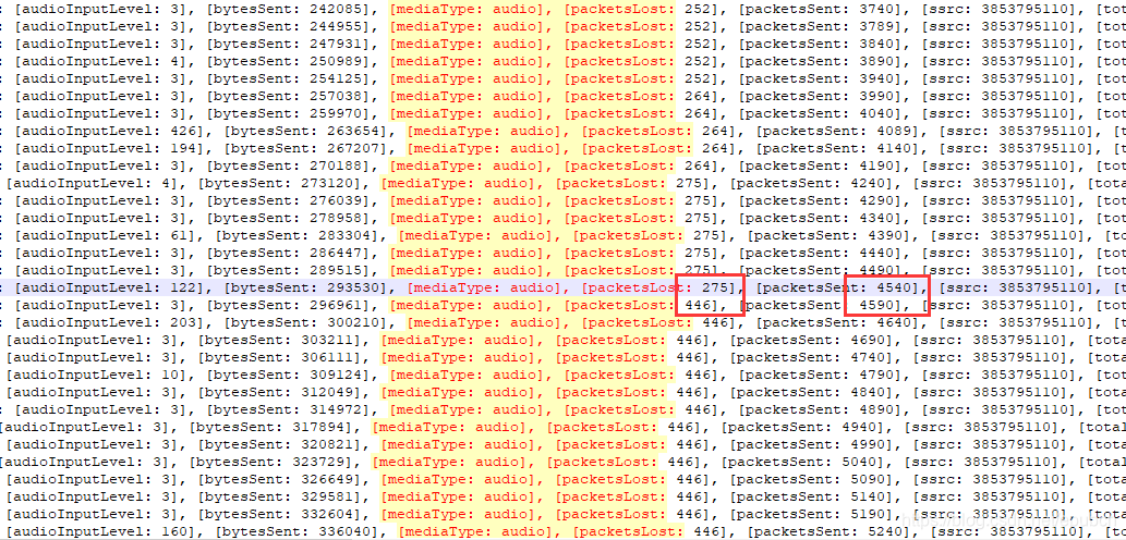 上图是通过WebRTC的StatsReport报上来的原始数据,每1秒打印一条,我过滤了其他,只保留了audio。从数据中我们很容易发现一个问题,就是每秒的packetsSent差都是50,但是packetsLost的值会发生275 -> 446 (差值171) 这种巨大的变化。