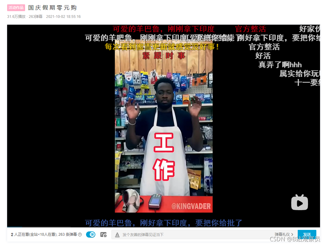 蜜雪冰城官方号就运用了时下外网最火的视频,二创了鬼畜视频,B站用户纷纷在弹幕刷梗,蜜雪冰城这波“紧跟时事”,也让“蜜雪冰城”这个品牌在B站再一次热起来。
