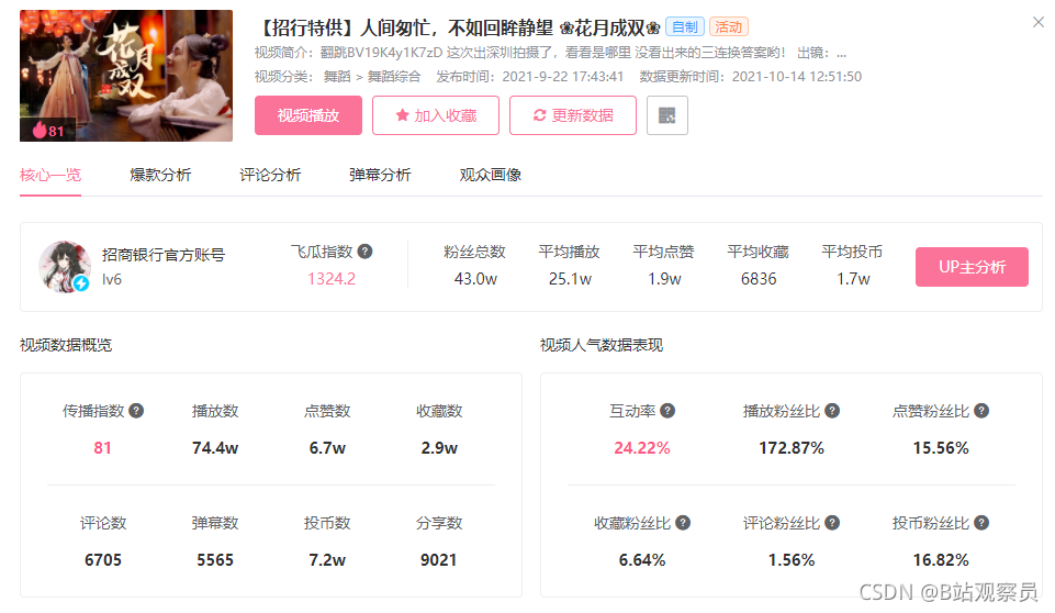 内容是抢占B站用户心智的重要一步。招商银行官方号创造原生梗“招行特供”,发布国风舞蹈视频,视频中的“舞者”就是“招行特供”——娴娴,美好清新的长相,灵动清雅的舞蹈、场景搭建、服装都成功吸引了大量B站用户的观看,根据飞瓜数据B站版数据显示视频播放量达到74.4w,弹幕数5565。