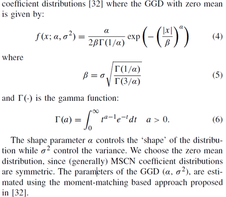 - 采用广义高斯模型(GGD)拟合失真图像与原始图像的MSCN经验分布。主要是估计GGD模型中的两个参数(