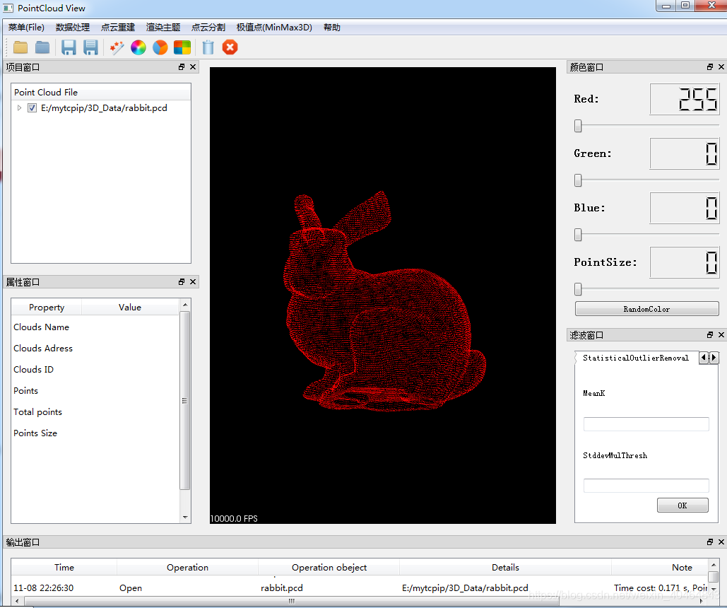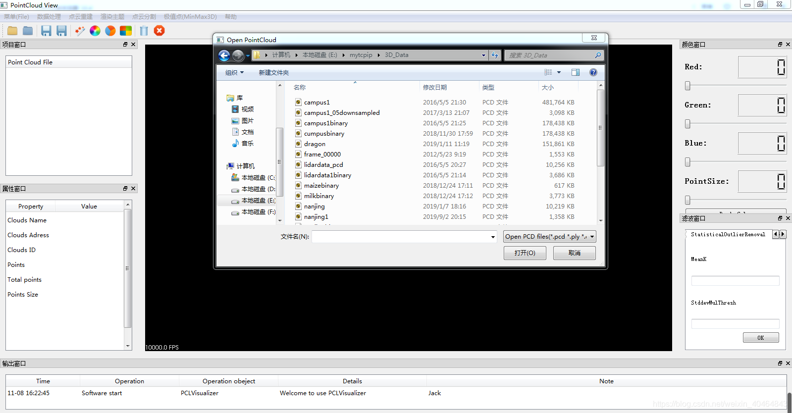点云数据是由很多个具有三维坐标 x, y, z 的点组成的数据格式,除了位置信息外,点云还可以包含颜色信息(点云的 RGB 值)、透明信息、法线信息等。目前常用的点云格式有 pcd, ply 以及 obj 格式。打开这三种格式的点云主要通过 Qt 库的文件对话框和 PCL 库中载入点云数据的函数实现。有的时候点云数据保存为txt格式,为了方便大家操作,可以直接点击“打开文本”按钮,可以直接读取txt格式的数据。