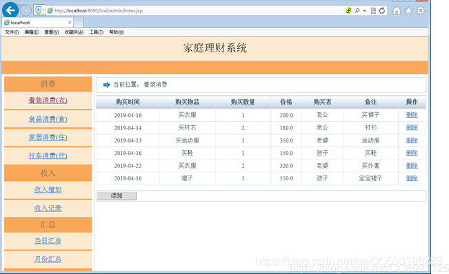 着装消费管理模块完成家庭成员的着装消费信息的添加或删除的操作,用户可以添加着装消费信息,也可以删除着装消费信息,着装消费管理模块对应的页面为yifuxiaofeimama.action。着装消费管理模块界面的设计如图5-3所示: