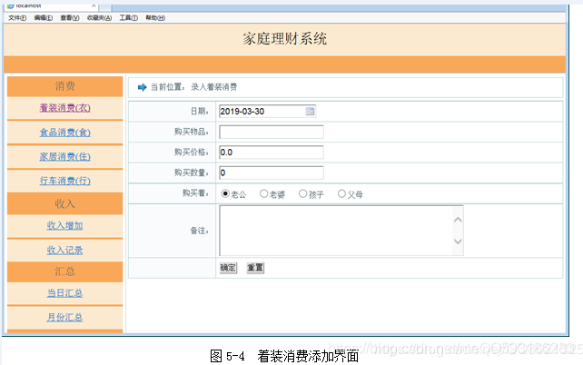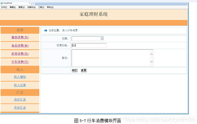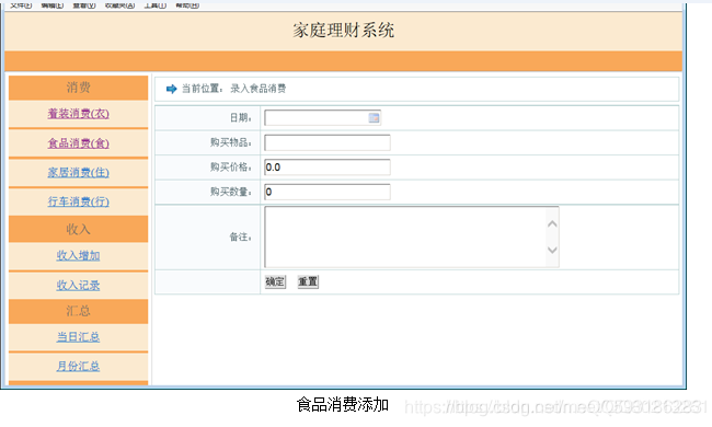 消费管理模块记录着家庭消费的相关信息,由四个子模块构成:着装消费、食品消费、家居消费、行车消费。