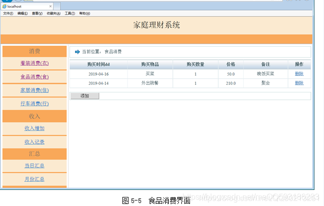 食口消费管理模块完成家庭饮食消费的记录功能,用户可以添加食品消费信息,也可以删除食品消费信息,食品消费管理模块对应的页面文件为shipinxiaofeimama.action。食品消费界面设计如图5-5所示:
