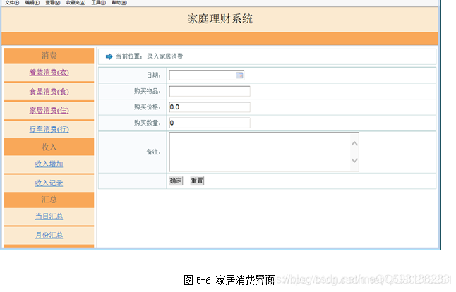 家居消费管理模块用于记录家居日常消费的功能,用户可以添加家居消费信息,也可以对家居消费记录进行删除操作,家居消费信息包括购买物品的名称,数量,价格,购买时间及说明等。家居消费管理模块对应的磁盘文件为jiajuxiaofeimama.action,家居消费界面设计如图5-6所示: