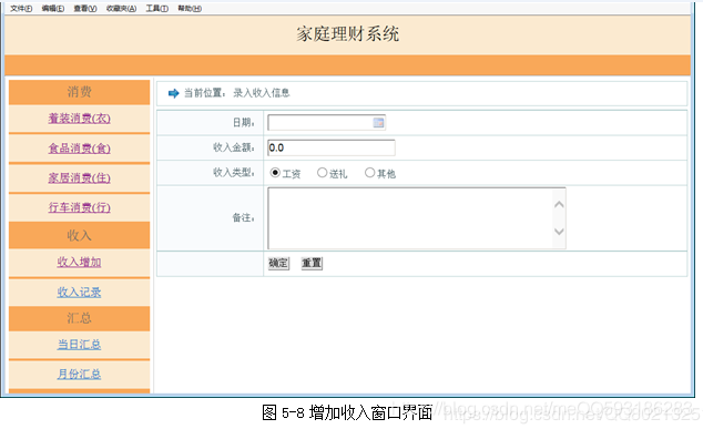 增加收入管理模块,完成收入信息的添加功能,在添加收入信息时,输入收入日期,收入金额,类别及说明等进行添加。增加收入管理模块的页面设计如图shouruadd.jsp,增加收入面设计如图5-8所示: